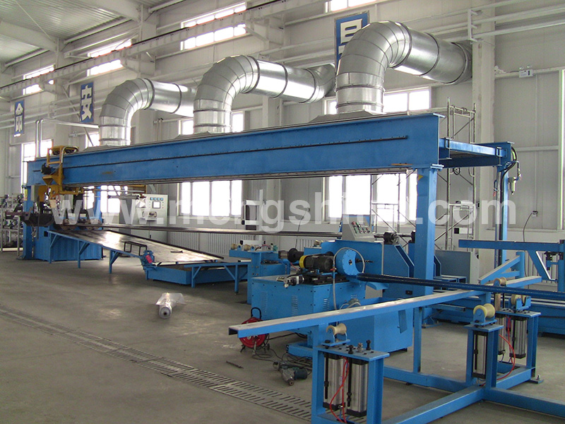一、該設備由一條二工位或者4工位微機控制纏繞機組、鋼制管模具蒸汽內(nèi)加熱及水冷脫模自控系統(tǒng)、以及輔助設備等組成??缮a(chǎn)管徑為2"~28"(DN50~DN700),單根管長9.15或12m。生產(chǎn)線設計年產(chǎn)量180 km(以2"管、工作壓力7MPa,每天16小時工作,每年按300天計算)。